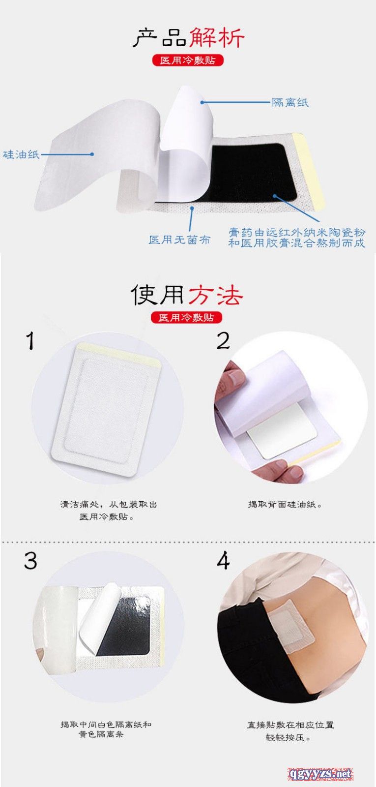 | 補(bǔ)充說明 | 【注意事項(xiàng)】1、開放性皮膚損傷請(qǐng)勿用。2、清潔產(chǎn)品貼用部位, 以免汗水、頭發(fā)等影響產(chǎn)品粘貼性。3、兒童需在醫(yī)師、家長的指導(dǎo)及監(jiān)督下使用。 4、超過有效期禁止使用。 【禁忌癥】使用時(shí)禁止與破損的皮膚直接接觸、孕婦及哺乳期婦女禁用。 【儲(chǔ)運(yùn)條件】密封、常溫下貯存,冷藏后使用效果更佳;密封、常溫下運(yùn)輸, 運(yùn)輸過程中輕拿輕放。 |