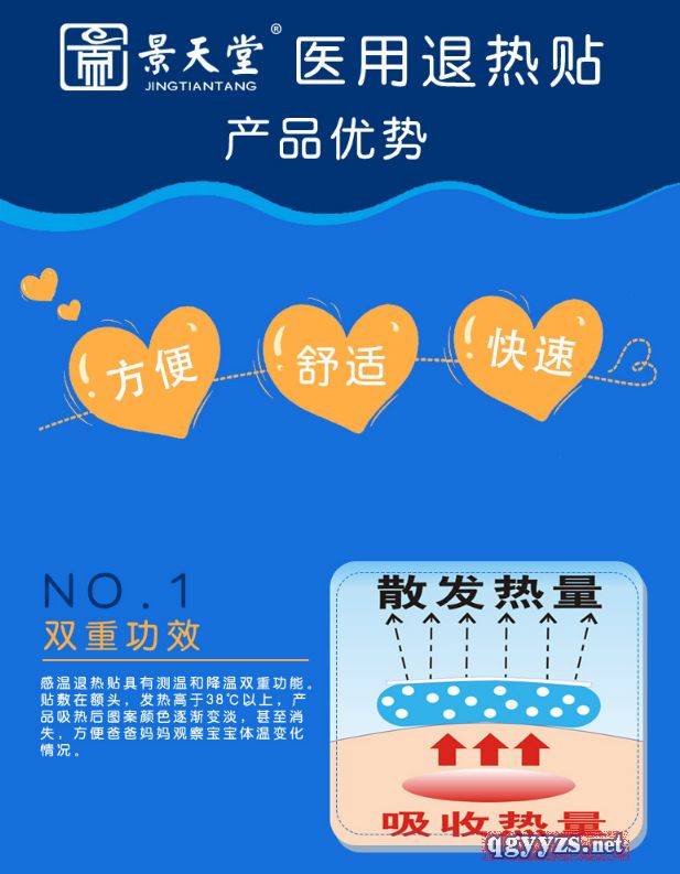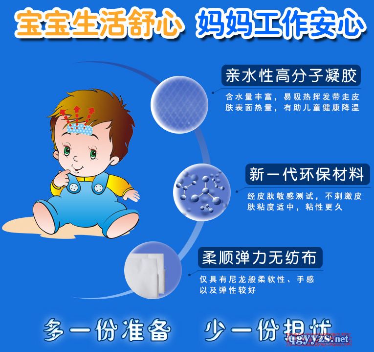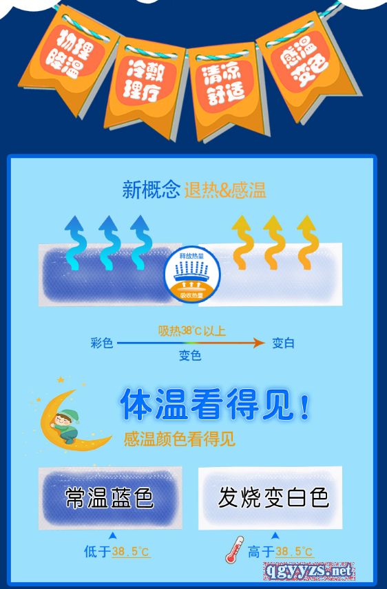 產(chǎn)品賣點(diǎn) 感溫變色,正常為藍(lán)色,發(fā)燒變白色。主要用于發(fā)熱患者的局部物理降溫,用于急、慢性發(fā)熱、頭痛、牙痛、跌打扭傷及暴曬后的局部降溫。適用于3月齡以上人群,物理退熱,冷敷理療。