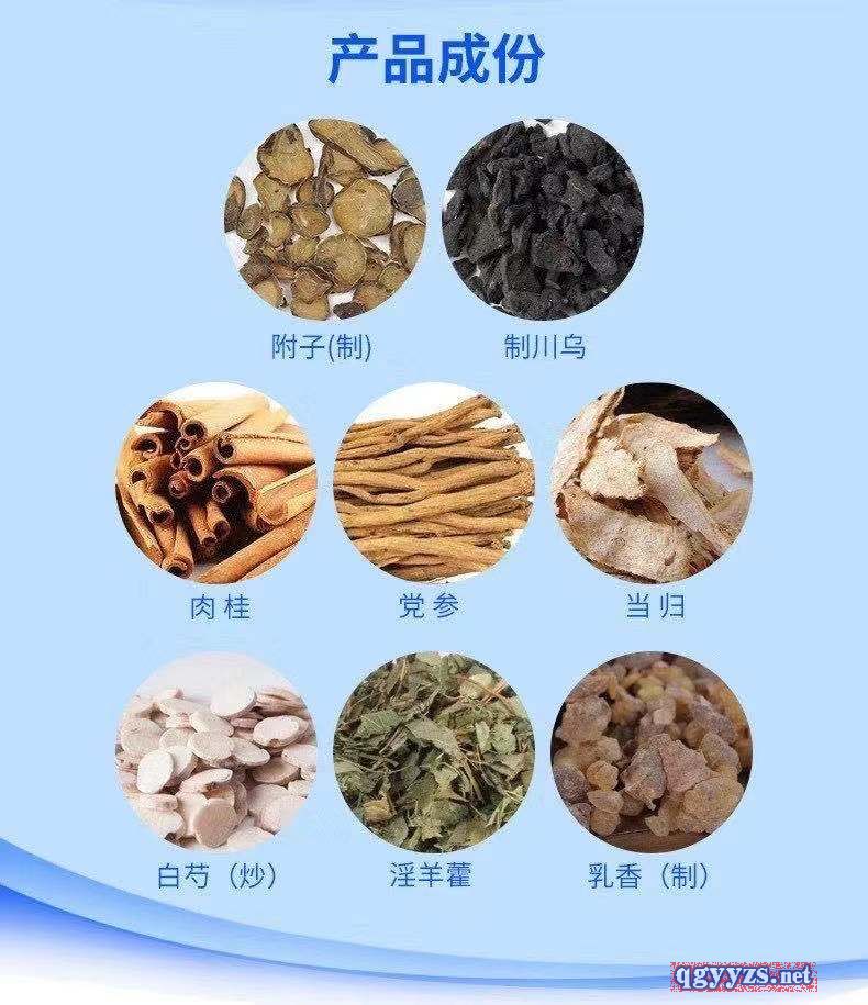 | 主要成分 | 附子(制)、制川烏、肉桂、黨參、當(dāng)歸、炒白芍、淫羊藿、醋乳香。 |
