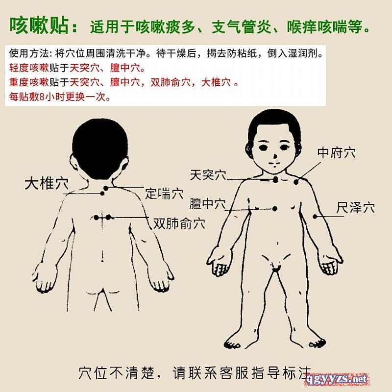 | 使用方法 | 將穴位周圍清洗干凈。待干燥后,揭去本品防粘紙,貼于天突穴、檀中穴、雙肺俞穴、大椎穴。每貼敷6-8小時(shí)更換一次。 |