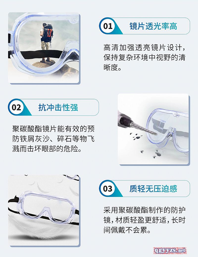 | 補(bǔ)充說明 | 一、鏡片透光率高:高清加強(qiáng)透亮鏡片設(shè)計,保持復(fù)雜環(huán)境中視野的清晰度。 二、抗沖擊性強(qiáng):聚碳酸酯鏡片能有效的預(yù)防鐵屑灰沙、碎石等物飛濺而擊壞眼部的危險。 三、質(zhì)輕無壓迫感:采用聚碳酸酯制作的防護(hù)鏡,材質(zhì)輕盈更舒適,長時間佩戴不會累。 |