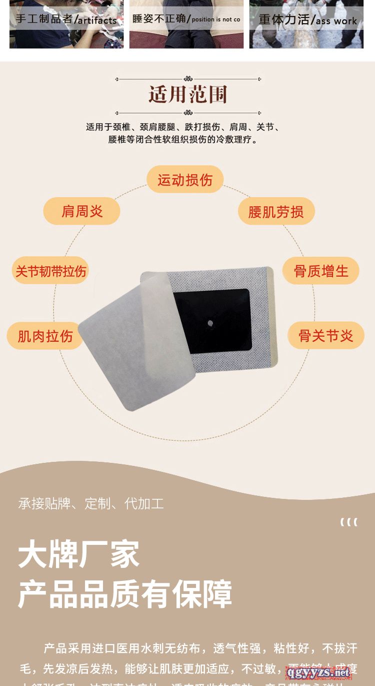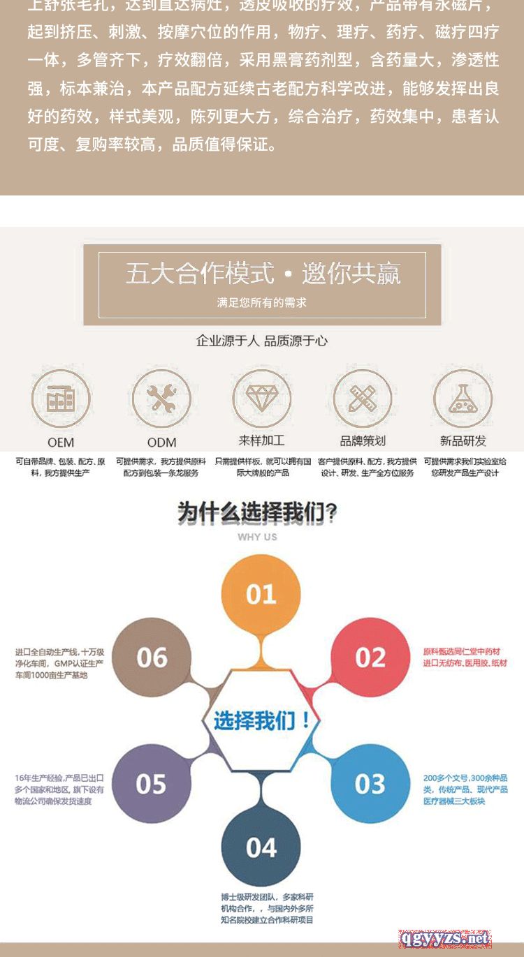 | 產(chǎn)品用途 | 產(chǎn)品采用進(jìn)口醫(yī)用水刺無紡布,舒適度高,透氣性強(qiáng),粘性好,不拔汗毛,先發(fā)涼后發(fā)熱,能夠讓肌膚更加適應(yīng),不過敏,更能夠大成度上舒張毛孔,達(dá)到直達(dá)病灶,透皮吸收的佳療效,產(chǎn)品帶有永磁片,起到擠壓、刺激、按摩穴位的作用,物療、理療、藥療、磁療四療一體,多管齊下,療效翻倍,采用黑膏藥劑型,含藥量大,滲透性強(qiáng),標(biāo)本兼治,本產(chǎn)品配方延續(xù)古老配方科學(xué)改進(jìn),能夠發(fā)揮出大的藥效,樣式美觀,陳列更大方,綜合治療,藥效集中,患者認(rèn)可度、復(fù)購率較高,是屬于市場良性循環(huán)的中高端產(chǎn)品。 |