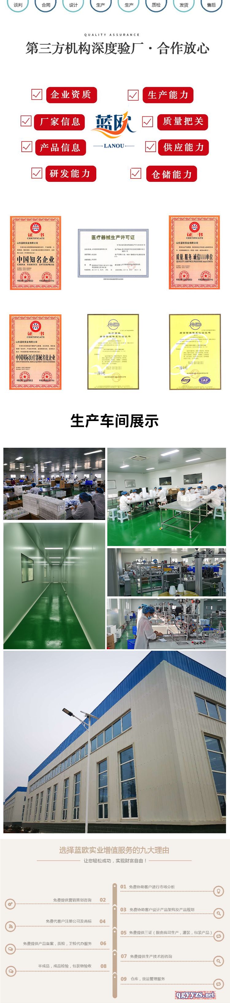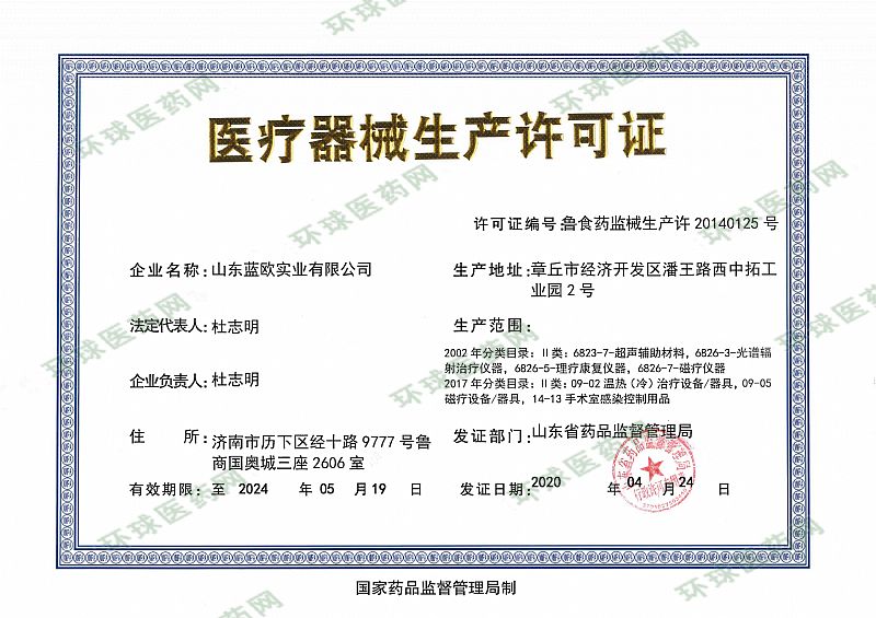 | 補(bǔ)充說明 | 山東藍(lán)歐實業(yè)有限公司成立于2007年,注冊資金壹仟萬元、是一家集醫(yī)療研發(fā)、生產(chǎn)、銷售、和醫(yī)療服務(wù)于一體的高科技企業(yè)專業(yè)研發(fā)生產(chǎn)醫(yī)療高科技產(chǎn)品,擁有一支國家級專家組成的聯(lián)合科技隊伍,是一支高素質(zhì)高追求,富有潮氣蓬勃的精英團(tuán)隊。 公司總部位于素有“泉城”美譽(yù)的歷史文化名城中國--濟(jì)南,辦公地理位置優(yōu)越,環(huán)境優(yōu)雅,是省市重點建設(shè)路段,現(xiàn)于全國上千家三級甲等、二級甲等醫(yī)院及千數(shù)家連鎖藥店房合作。 山東藍(lán)歐實業(yè)有限公司以人才為基礎(chǔ),以市場為導(dǎo)向,以科學(xué)管理為后盾,以高科技產(chǎn)品為支柱,以社會效益為*終目的,在做“中國*有價值的國際化醫(yī)療企業(yè)”的愿景下指引,藍(lán)歐將不斷拓展新的里程。公司具有科學(xué)化、規(guī)范化的現(xiàn)代企業(yè)管理體系,公司曾榮獲“中國質(zhì)量、信譽(yù)、服務(wù)AAA級企業(yè)”,其產(chǎn)品投放市場以來,深受用戶好評,公司始終將產(chǎn)品質(zhì)量放在首位,從產(chǎn)品設(shè)計到生產(chǎn)都是在一套嚴(yán)格的質(zhì)量體系下進(jìn)行。公司將以*新的科技成果*好的治療效果、*佳的服務(wù)質(zhì)量,回報社會、造福人類。 |