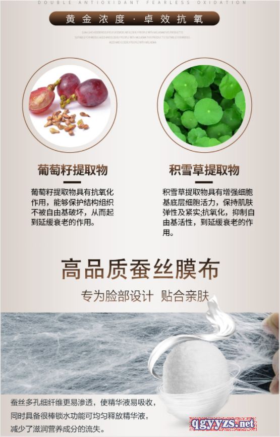| 產(chǎn)品賣點(diǎn) | 葡萄籽提取物具有抗氧化的作用,能夠保護(hù)結(jié)構(gòu)組織不被自由基破壞,葡萄籽提取物具有抗氧化的作用,能夠保護(hù)結(jié)構(gòu)組織不被自由基破壞,加上含天然補(bǔ)水成分透明質(zhì)酸,自然界保濕型很好筋質(zhì),攜節(jié)豐富的水分,有效改善肌膚彈力,收斂毛孔,滋養(yǎng)肌膚,同時(shí)修復(fù)受損肌膚令肌膚恢復(fù)清透自然清爽舒適 |
