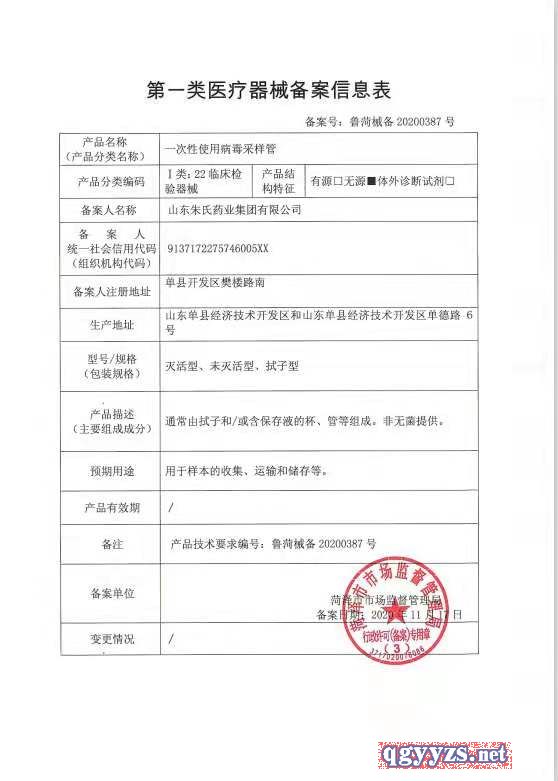 | 產(chǎn)品名稱 | 一次性使用病毒采樣管 |