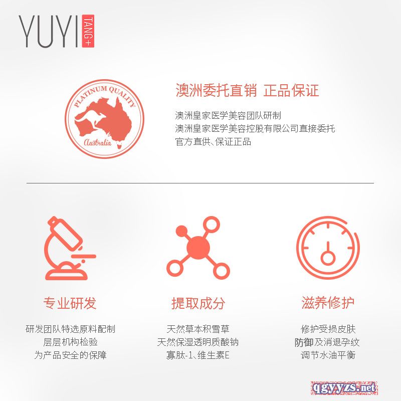 | 其它說明 | 來自于澳洲**醫(yī)學(xué)美容團(tuán)隊研制,廣袤的澳洲大陸有著純凈無污染的地理生態(tài)資源,是護(hù)膚品重要原料來源的主要國家之一。由研發(fā)團(tuán)隊特選親膚溫和的原料配制,通過層層機(jī)構(gòu)檢驗,為YUYITANG產(chǎn)品提供有效的保障 |