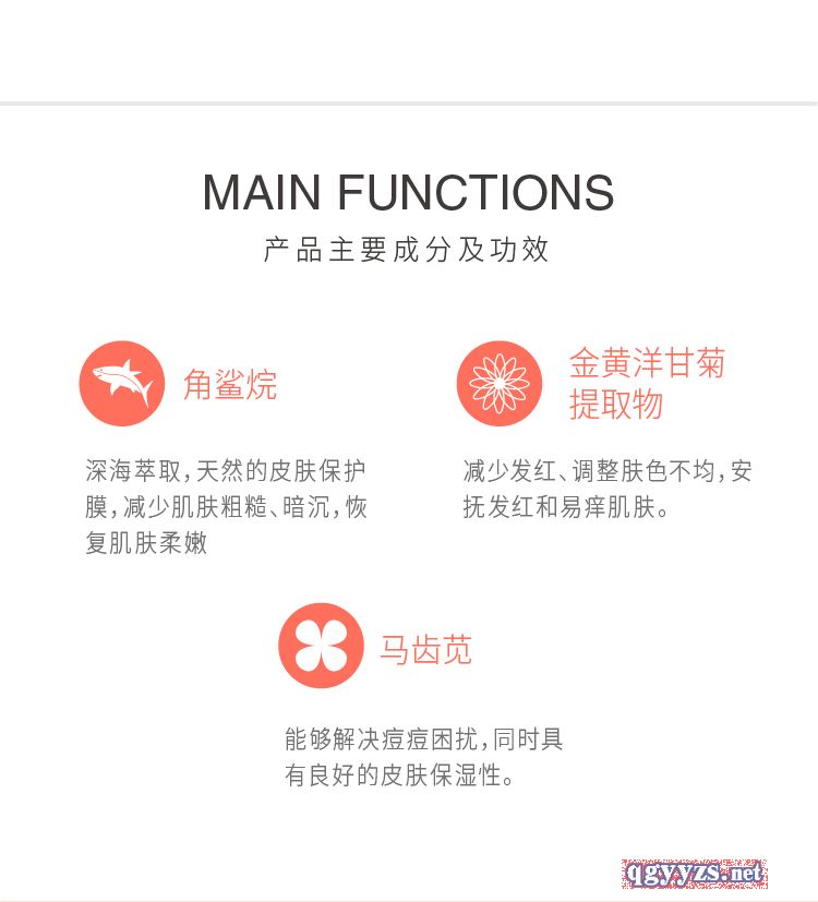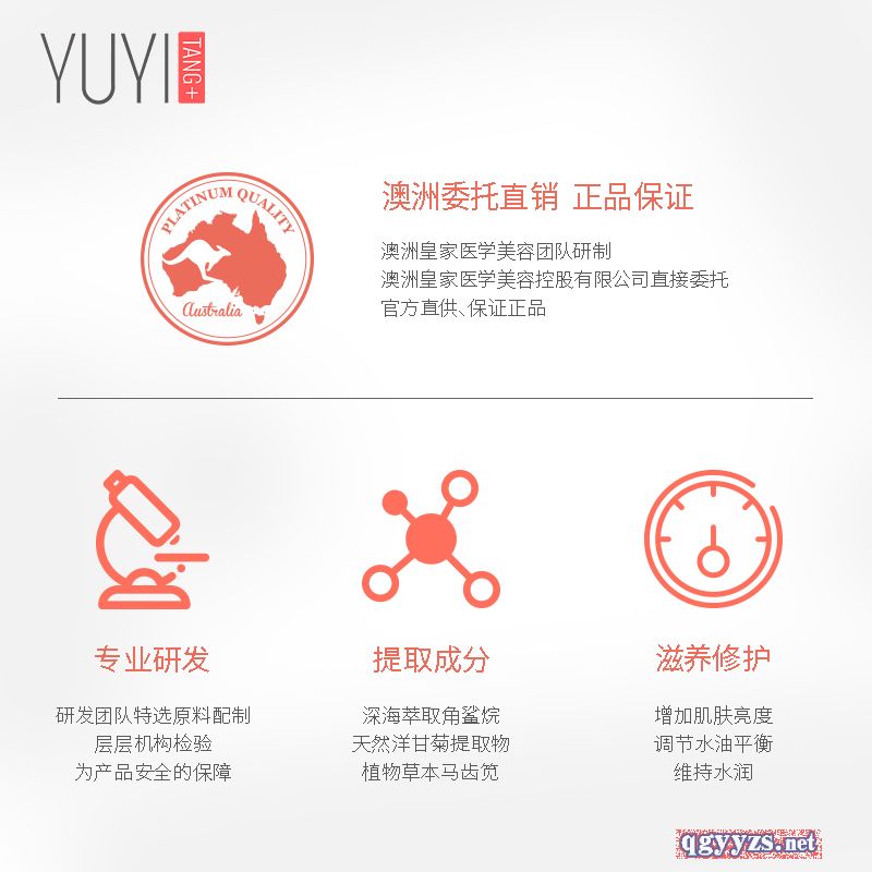 | 其它說(shuō)明 | 來(lái)自于澳洲皇家醫(yī)學(xué)美容團(tuán)隊(duì)研制,廣袤的澳洲大陸有著純凈無(wú)污染的地理生態(tài)資源,是護(hù)膚品重要原料來(lái)源的主要國(guó)家之一。由研發(fā)團(tuán)隊(duì)特選親膚溫和的原料配制,通過(guò)層層機(jī)構(gòu)檢驗(yàn),為YUYITANG產(chǎn)品提供有效的保障 |