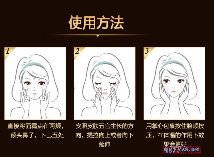 | 使用方法 | 霜應(yīng)先點涂在額頭、面頰、鼻尖及下巴,然后用中指及無名指輕輕打圈涂在嘴唇周圍。臉部按斜向外向上的方式涂抹,額頭則可用雙手手掌進行提拉涂抹。同時按摩,使其更深入皮膚。也可以用“按壓”的方式涂抹,以免產(chǎn)生小細紋 |