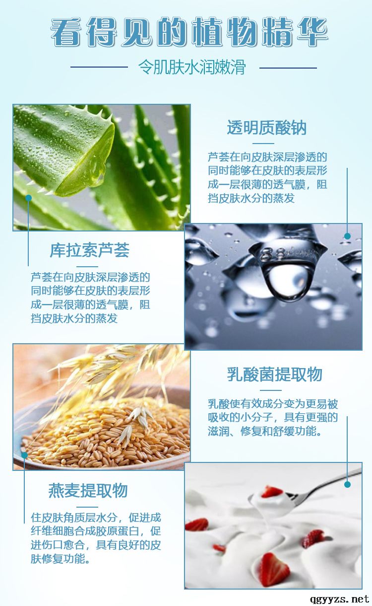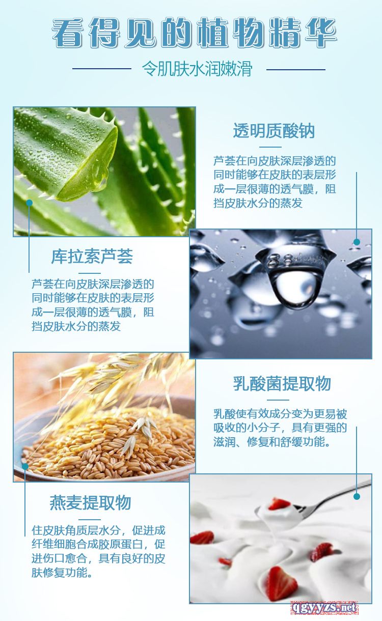 | 主要成分 | ["水","丁二醇","庫(kù)拉索蘆薈(ALOEBARBADENSIS)葉汁","燕麥(AVENASATIVA)仁提取物","(透明質(zhì)酸,辛甘醇,水,1,2-己二醇,PCA鈉,生育酚(維生素E),乳酸)","甘油","馬齒莧(PORTULACAOLERACEA)提取物" |