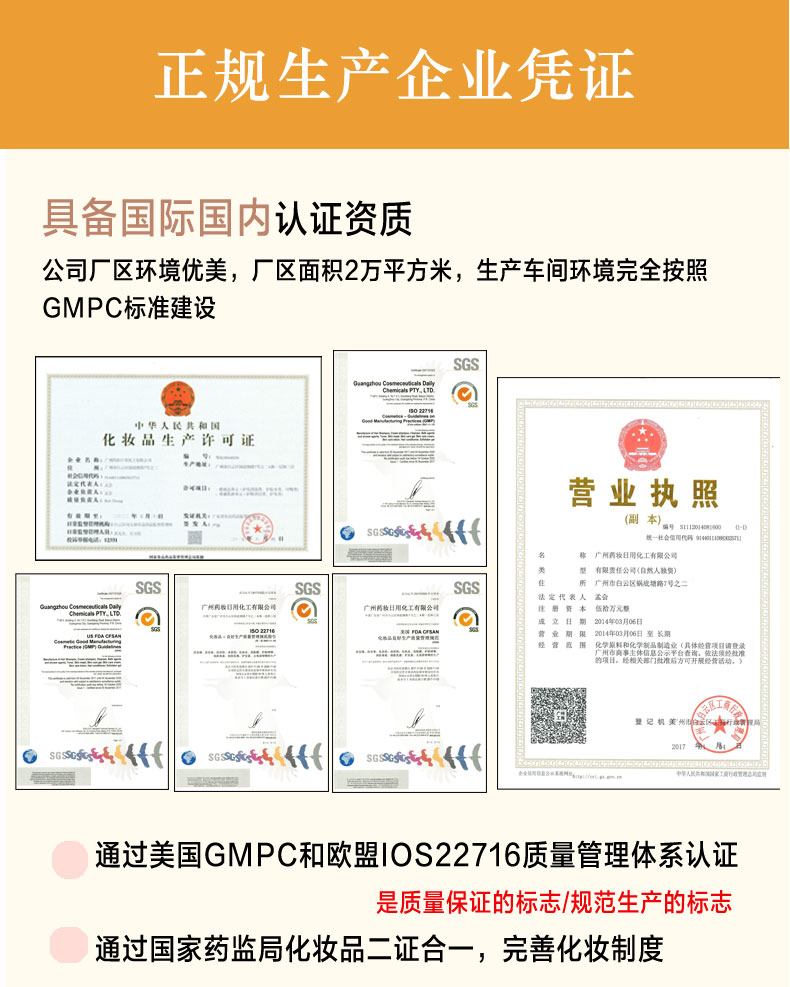 | 補充說明 | 廣州**日用化工有限公司--是工商局注冊的一家正規(guī)護膚品生產(chǎn)企業(yè),多年來已經(jīng)與澳大利亞皇家醫(yī)學(xué)美容控股有限公司強強聯(lián)手打造成為以科研,生產(chǎn)銷售,品牌策劃,OEM加工,國內(nèi)外貿(mào)易服務(wù)的強大組合,一直致力于天然中草藥植物護膚領(lǐng)域的研發(fā),生產(chǎn)符合****標(biāo)準(zhǔn)化的化妝品。工廠擁有現(xiàn)化制造基地近2萬平方米,擁有妝字號車間和消字號車間,引進國際*先進的德國專業(yè)生產(chǎn)設(shè)備,10萬級凈化車間,30萬級包裝車間,全套自動化生產(chǎn)線,利用先進的生產(chǎn)設(shè)備和雄厚的技術(shù)力量為依托,嚴格按照《化妝品生產(chǎn)許可105條檢查要點》標(biāo)準(zhǔn)生產(chǎn)和管理,確保產(chǎn)品的品質(zhì)。廣州**匯集了中外藥理學(xué)、中藥學(xué)、植物學(xué)、化學(xué)工程學(xué)和精細化工等學(xué)科的專業(yè)研發(fā)人員,精心選擇優(yōu)質(zhì)***原料以及*佳的配方組合方案,為生產(chǎn)*優(yōu)質(zhì)的產(chǎn)品奠定堅實的基礎(chǔ)。 |