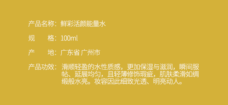| 使用方法 | 早晚使用,噴涂適量「活顏能量水」,于清潔后的臉部與頸部,使肌膚充分準備好,以完美吸收后續(xù)保養(yǎng)品。 |