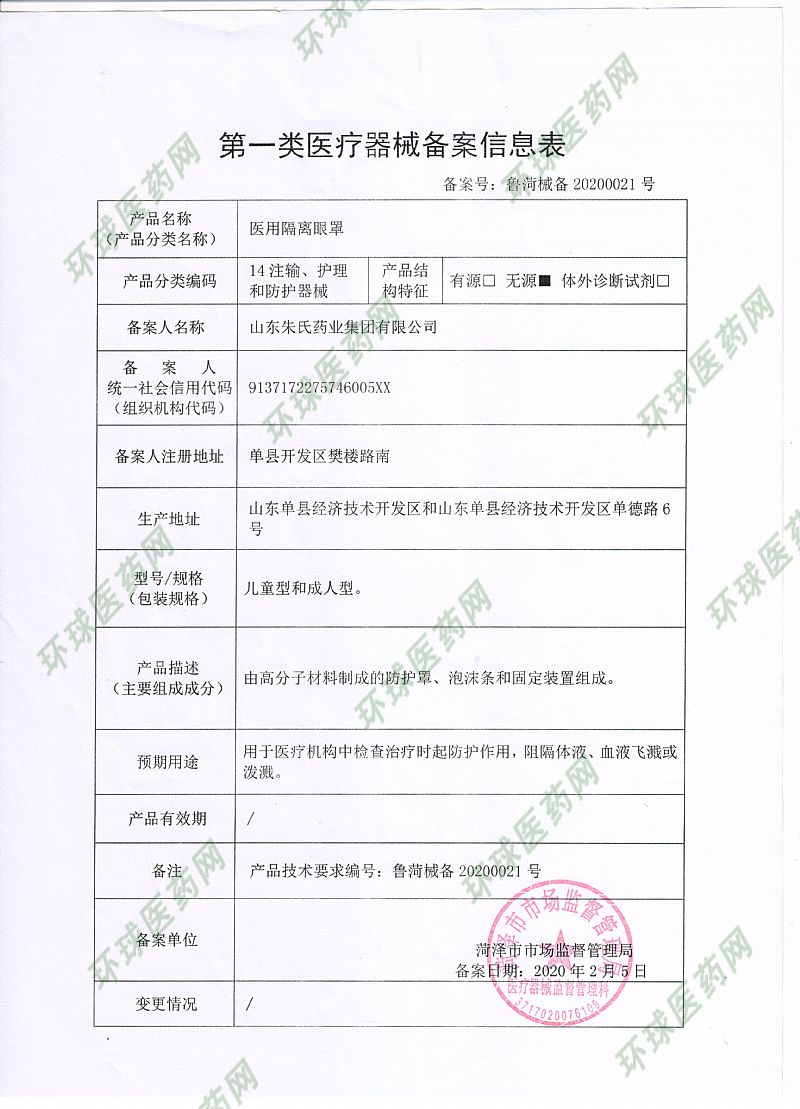 | 作用機(jī)理 | 用于醫(yī)療機(jī)構(gòu)中檢查治療時(shí)起防護(hù)作用,阻隔體液、血液飛濺或潑濺。 【備案人名稱】山東朱氏藥業(yè)集團(tuán)有限公司 【生產(chǎn)企業(yè)】山東朱氏藥業(yè)集團(tuán)有限公司 【住所】單縣開發(fā)區(qū)樊樓路南 【生產(chǎn)地址】山東單縣經(jīng)濟(jì)技術(shù)開發(fā)區(qū)和山東單縣經(jīng)濟(jì)技術(shù)開發(fā)區(qū)單德路6號(hào) |
