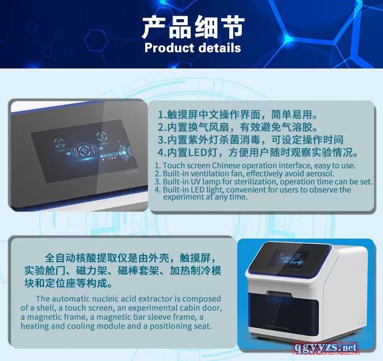 | 作用機(jī)理 | 原理為磁珠吸附方法。全自動(dòng)核酸提取儀是由外殼,觸摸屏,實(shí)驗(yàn)艙門、磁力架、磁棒套架、加熱制冷模塊和定位座等構(gòu)成。 |