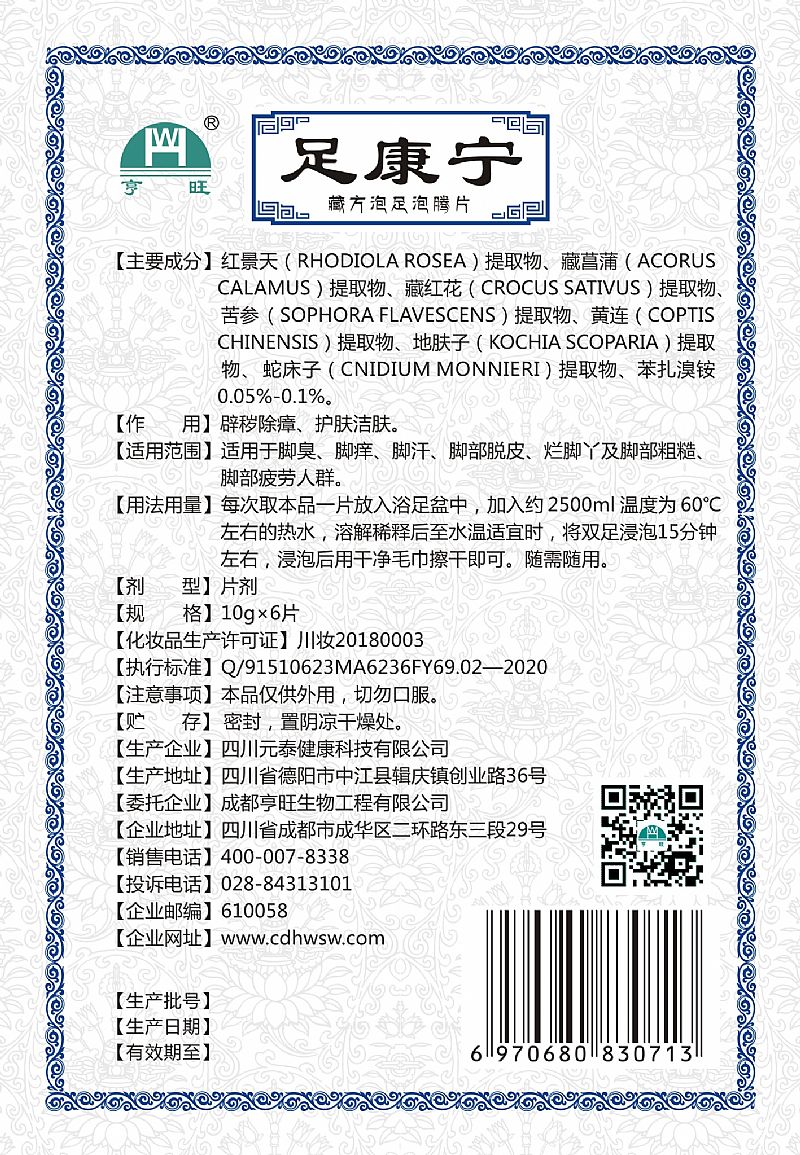 | 用法用量 | 每次取本品一片放入浴足盆中,加入約2500ml溫度為60℃左右的熱水,溶解稀釋后至水溫適宜時,將雙足浸泡15分鐘左右,浸泡后用干凈毛巾擦干即可。隨需隨用。 |