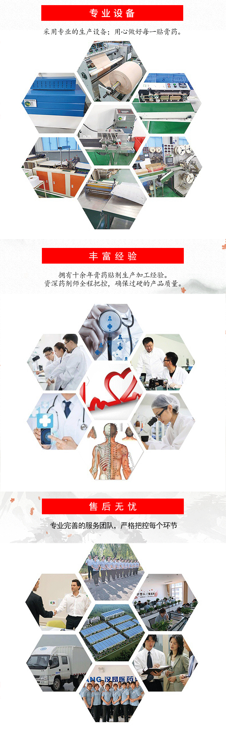 | 補充說明 | ·產(chǎn)品涵蓋:膏藥、發(fā)熱貼、磁療貼、靜電理療貼、肚臍貼、足療貼、退熱貼、暖貼、眼貼、穴位貼等; ·布種類:無紡布、彈力布、水刺布、防粘布、純棉布等; ·價格說明:根據(jù)具體尺寸、布料、藥芯、防滲膜、防滲圈等產(chǎn)品具體制作信息核算價格; ·產(chǎn)品優(yōu)勢:滲透好、自行發(fā)熱、見效快、效果明顯 |