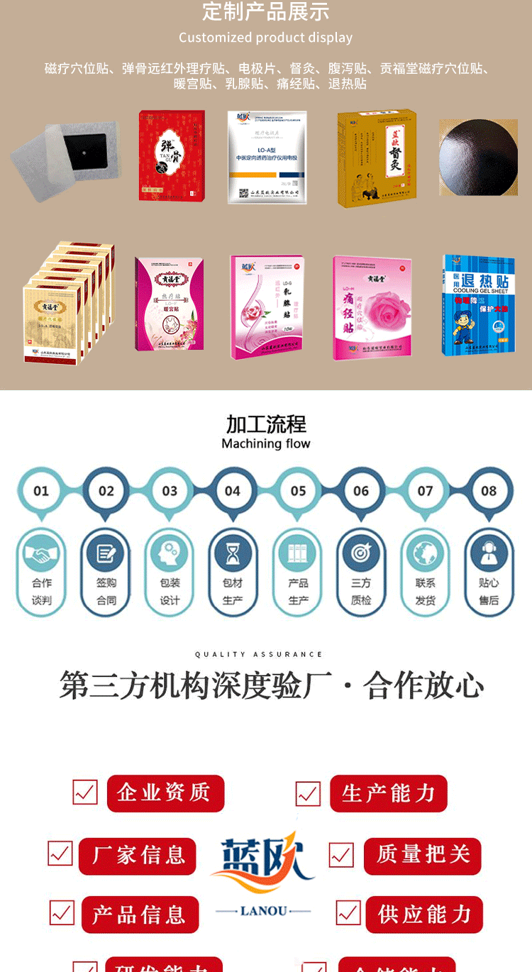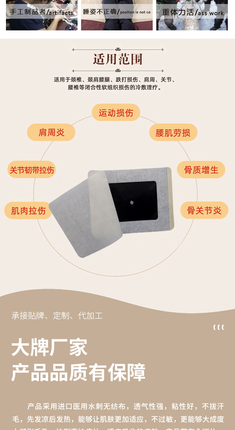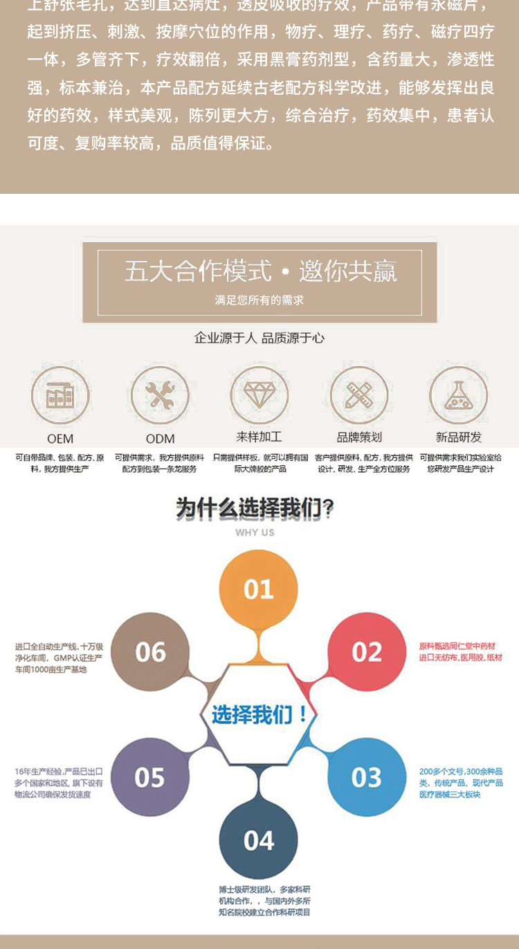 | 產(chǎn)品賣(mài)點(diǎn) | 產(chǎn)品采用進(jìn)口醫(yī)用水刺無(wú)紡布,舒適度高,透氣性強(qiáng),粘性好,不拔汗毛,先發(fā)涼后發(fā)熱,能夠讓肌膚更加適應(yīng),不過(guò)敏,更能夠*大成度上舒張毛孔,達(dá)到直達(dá)病灶,透皮吸收的療效,產(chǎn)品帶有永磁片,起到擠壓、刺激、按摩穴位的作用,物療、理療、藥療、磁療四療一體,多管齊下,療效翻倍,采用黑膏藥劑型,含藥量大,滲透性強(qiáng),,本產(chǎn)品配方延續(xù)古老配方科學(xué)改進(jìn),能夠發(fā)揮出的藥效,樣式美觀,陳列更大方,綜合治療,藥效集中,患者認(rèn)可度、復(fù)購(gòu)率較高,是屬于市場(chǎng)良性循環(huán)的中高端產(chǎn)品。 |