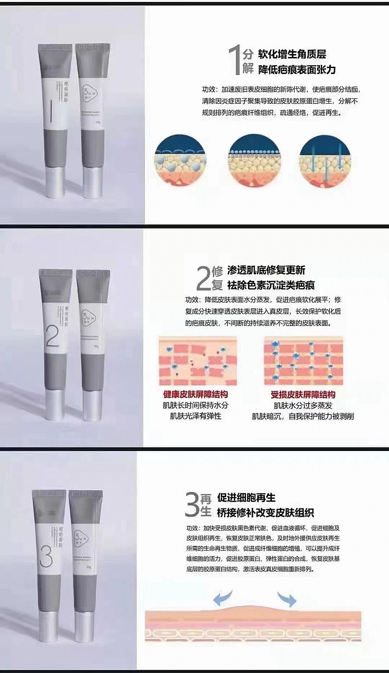 | 產(chǎn)品賣點 | 1、定向祛疤效果好,適合多種類型疤痕。 2、二類6864醫(yī)療器械藥監(jiān)局備案,可進醫(yī)院,多地掛網(wǎng) 3、外包裝采用已拉棉絮環(huán)保紙,內(nèi)包裝采用鋁塑瓶灰的理念,灰的優(yōu)雅,灰色的內(nèi)斂 |
