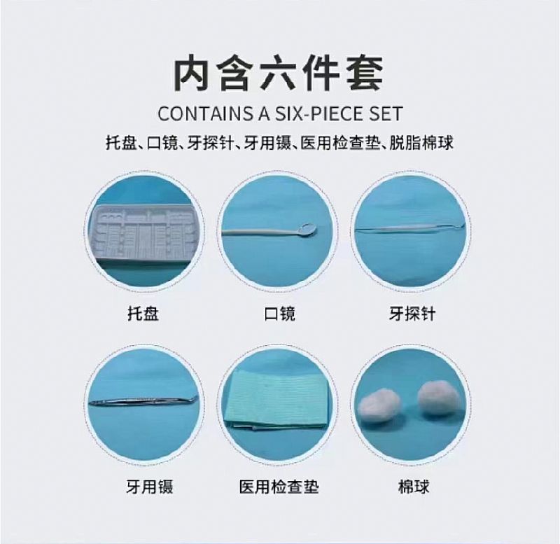 | 主要成分 | 通常由托盤、口鏡、牙探針、牙用鑷、醫(yī)用檢查墊、脫脂棉球、檢查手套、吸唾管、水槍頭組成,非無菌提供,一次性使用。 |