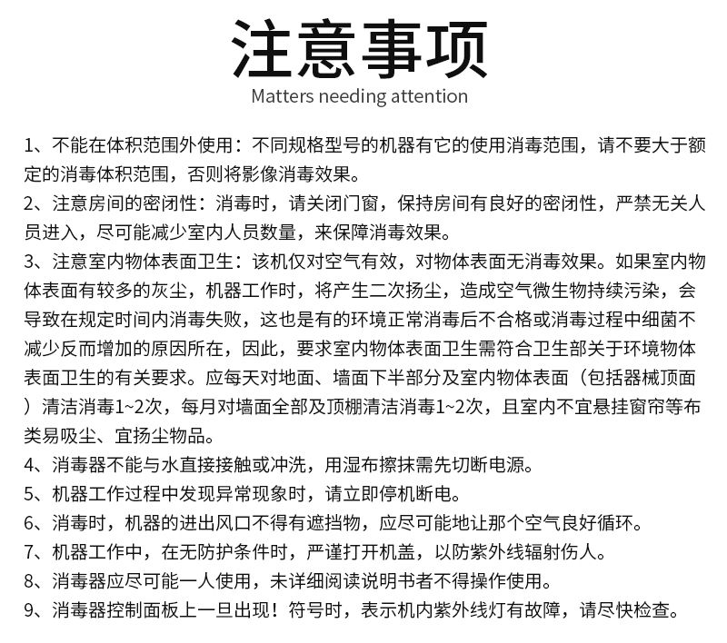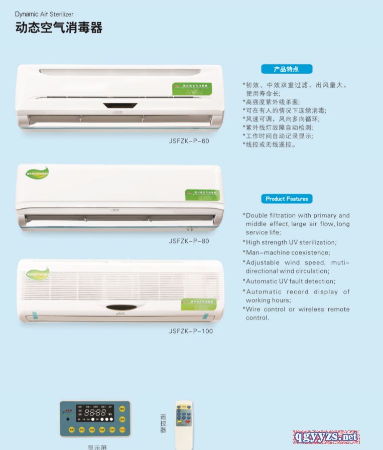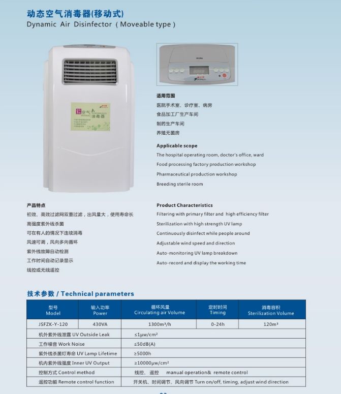 | 補充說明 | 產(chǎn)品特點 掛壁式空氣消毒器型可直接掛于墻壁上,移動式靈活應(yīng)用各個場所 該種機型屬動態(tài)消毒型,是為人機共處環(huán)境而設(shè)計的,消毒達標(biāo),此種機型是本公司技術(shù)成熟的消毒產(chǎn)品,邊消毒邊工作,消毒凈化空氣。 利用循環(huán)風(fēng)紫外線殺菌原理,,人機共處,在有人的環(huán)境下動態(tài)連續(xù)消毒。 消毒器內(nèi)置的空氣過濾系統(tǒng)采用了層流潔凈技術(shù)中的物理過濾方法除去空氣中的塵埃和細菌,初、中效活性炭光觸媒過濾除塵、除菌, 科學(xué)地運用了長壽命紫外線燈管近距離瞬間殺菌技術(shù),有效地針對空氣中的細菌、病毒,污染源,防止疾病傳播,提高空氣質(zhì)量,保護醫(yī)護人員和患者的健康。 ★紫外線燈于機器內(nèi)部,不易泄漏,操作簡單,可靠實用方便,工作時空氣中的濃度臭氧量≤0.1mg/m3,本機是通過循環(huán)風(fēng)的方式進,大循環(huán)風(fēng)量設(shè)計(機器風(fēng)量必須達到被消毒空氣體積的8倍以上才能達到消毒效果),把消毒室空間的空氣吸入機器內(nèi)部,再經(jīng)過機器內(nèi)部的高強度近距離紫外線照射殺菌之后釋放出消毒室(機器內(nèi)部紫外線強度≥10000μω/ cm2,壽命≥5000h),此外該空氣消毒機內(nèi)部還采用了三種輔助功能的消毒工具: 1負離子發(fā)生器(移動式標(biāo)配);2活性炭過濾網(wǎng);3光觸媒過濾網(wǎng) 配有高強度紫外線雙管H型殺菌燈近距離殺菌,壽命長, 出風(fēng)量大,風(fēng)速高中低速可調(diào),有擺風(fēng) 控制:微電腦智能處理系統(tǒng)控制,可按設(shè)置程序自動選擇消毒時段,每日可設(shè)置三個時段自動開機實現(xiàn)自動消毒,消毒完后自動關(guān)機 遙控:顯示(工作時間)、清零、定時、風(fēng)速、風(fēng)向、運行/停止、開/關(guān)、增加、減少、菜單、手控:菜單、選擇、增加、定時、風(fēng)速、風(fēng)向、開/關(guān) 累時:工作時間顯示功能,累積時間輕松可查,燈管更換后時間可以清零,方便維護保養(yǎng) 報警:機內(nèi)電機、紫外線燈管等故障報警提示 記憶:電腦程序和時鐘均有記憶功能,斷電后復(fù)電重啟,無須重新設(shè)置,機器按原定程序運行 適用范圍 醫(yī)院:門診室、手術(shù)室、產(chǎn)房、導(dǎo)管室、新生兒室、兒科病房、母嬰同室、婦科檢查室、換藥室、供應(yīng)室、無菌室、燒傷病房、移植室、重癥監(jiān)護病房、血液疾病區(qū)及二、三類環(huán)境等。 化妝品、食品飲料廠:生產(chǎn)車間、包裝車間、無菌室等。 公共場所:會議室、賓館、娛樂場所、辦公室、服務(wù)中心等。 家庭 |