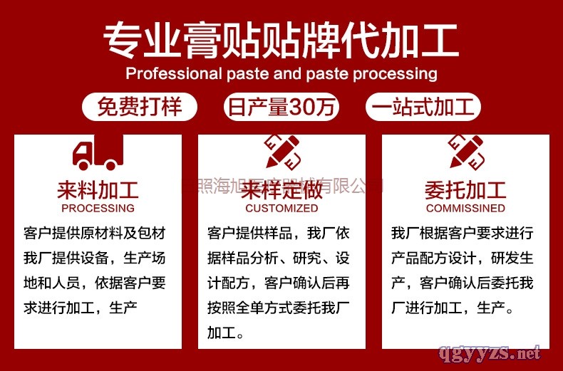 - 海旭醫(yī)療主要承接各類暖宮貼定制、遠(yuǎn)紅外理療貼代加工、磁療貼貼牌加工、穴位敷貼廠家、灸熱貼代加工、退熱貼代加工、燙熨治療包定制、小兒咳 喘腹瀉膏藥定制加工、艾灸貼定制、化妝品定制、保健食品定制、噴劑、乳膏類加 工等醫(yī)院臨床和終端診所所需的系列產(chǎn)品。公司的經(jīng)營(yíng)范圍有:骨科,婦科、男科、手術(shù)科、五官科和小兒科等。