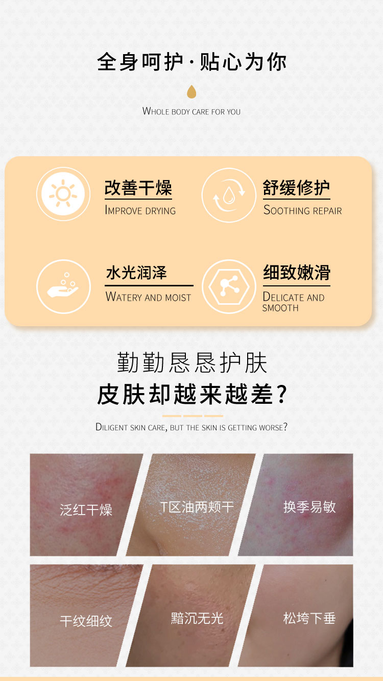 | 產(chǎn)品用途 | 改善臉部干燥、舒緩修復(fù)、水光潤澤 |