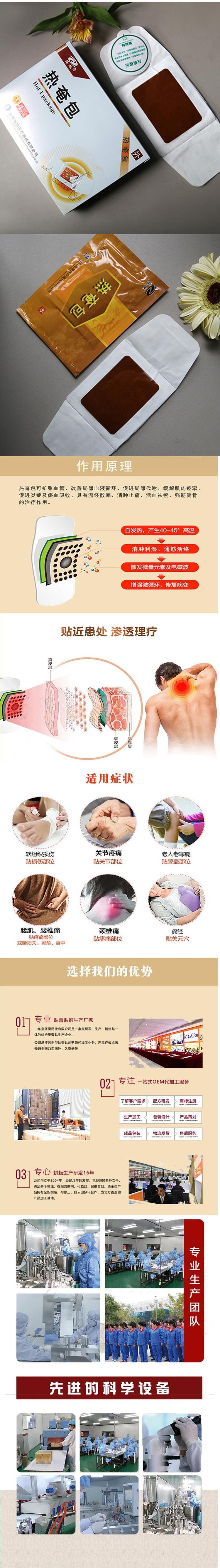 - 海旭醫(yī)療主要承接各類暖宮貼定制、遠(yuǎn)紅外理療貼代加工、磁療貼貼牌加工、穴位敷貼廠家、灸熱貼代加工、退熱貼代加工、燙熨治療包定制、小兒咳 喘腹瀉膏藥定制加工、艾灸貼定制、化妝品定制、保健食品定制、噴劑、乳膏類加 工等醫(yī)院臨床和終端診所所需的系列產(chǎn)品。公司的經(jīng)營范圍有:骨科,婦科、男科、手術(shù)科、五官科和小兒科等。