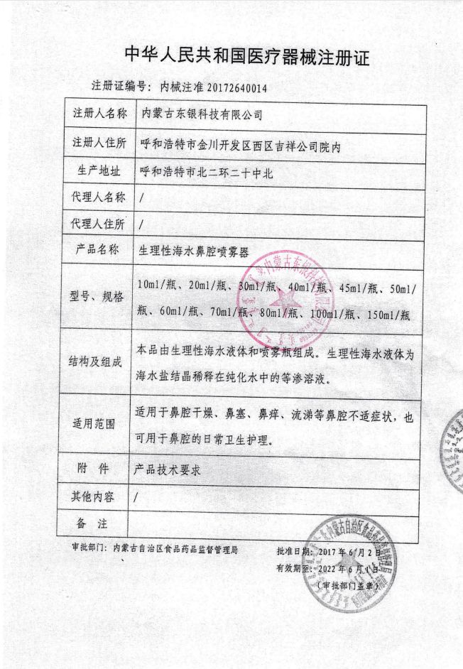 | 補充說明 | 1、 銀諾潔生理性海水鼻腔噴霧器可為人體提供所需的礦物質(zhì)和海水微量元素。修正鼻腔PH值,清潔和濕潤鼻腔,改善鼻腔生理功能環(huán)境,恢復(fù)鼻腔粘膜分泌功能及纖毛運動,提高鼻腔免疫力。 2、 銀領(lǐng)生理性海水鼻腔噴霧器是生理性海水提取液,不含藥物、不含激素。 3、恢復(fù)鼻腔自動分泌及清潔功能,銀領(lǐng)生理性海水鼻腔噴霧器能幫助鼻腔分泌功能自動恢復(fù)正常,這是其他藥物無法辦到的。讓我們來看一下是如何發(fā)揮這種功效--當(dāng)適當(dāng)?shù)膲毫εc微米級的水霧體沖洗鼻腔時,鼻纖毛根部的臟物會經(jīng)沖洗被帶走,使長期伏倒的鼻纖毛能脫離糾結(jié)的臟物“站立”起來,恢復(fù)鼻腔粘膜分泌粘液及纖毛運動的正常功能,并可保持鼻腔濕潤,恢復(fù)鼻粘液的正常PH值。 注冊證號:內(nèi)械注準(zhǔn)20172640014 |