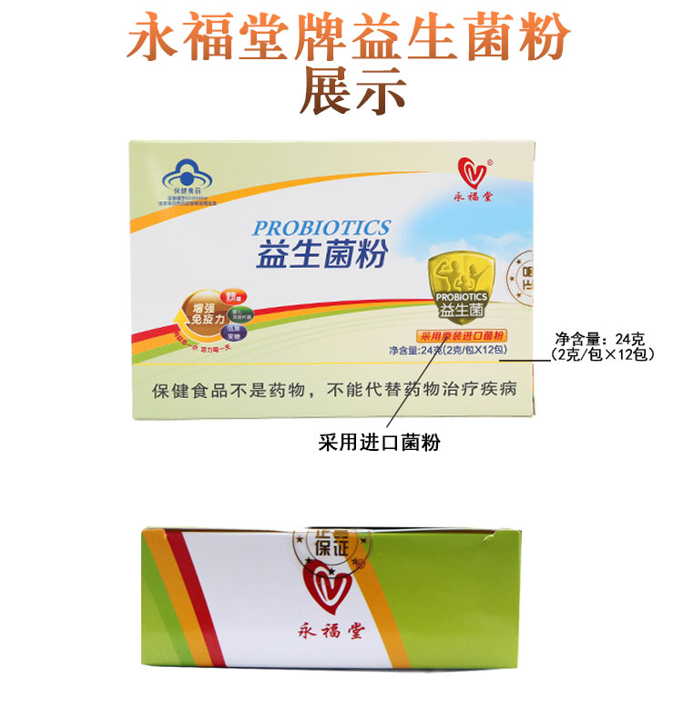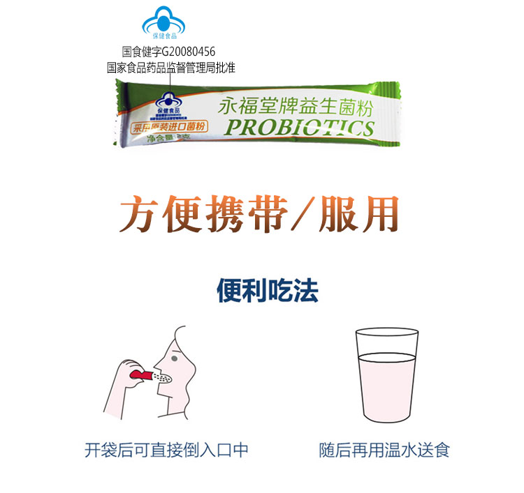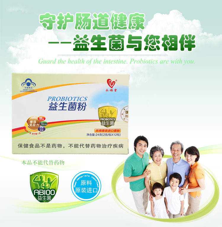 | 作用機(jī)理 | 本品是以嬰兒雙歧桿菌凍干粉、嗜酸乳桿菌凍干粉、低聚果糖、麥芽糊精為主要原料制成的保健食品,經(jīng)動(dòng)物功能試驗(yàn)證明,具有增強(qiáng)免疫力的保健功能。 產(chǎn)品名稱:永福堂牌益生菌粉 主要原料:嬰兒雙歧桿菌凍干粉、嗜酸乳桿菌凍干粉、低聚果糖、麥芽糊精 功效成分/標(biāo)志性成分含量:每100g含:嬰兒雙歧桿菌1.0x108cfu、嗜酸乳桿菌1.0x108cfu 保健功能:本品經(jīng)動(dòng)物實(shí)驗(yàn)評(píng)價(jià),具有增強(qiáng)免疫力的保健功能 適宜人群:免疫力低下者 不適宜人群:嬰幼兒 食用方法及食用量:每日2次,每次1袋,溫開水沖食 產(chǎn)品規(guī)格:2g/袋 保質(zhì)期:15個(gè)月 執(zhí)行標(biāo)準(zhǔn):Q/AK0003S 儲(chǔ)藏方法:陰涼干燥處保存,冷藏保存效果更佳 注意事項(xiàng):本品不能代替藥物 |