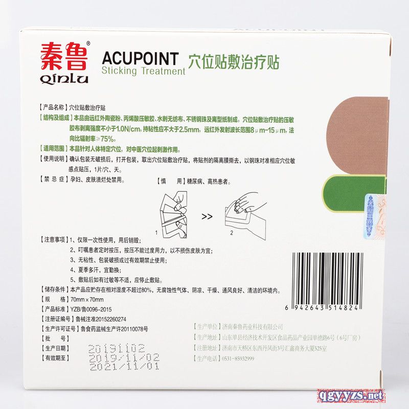 | 補(bǔ)充說明 | 【功能主治】:適用于頑固性失眠、神經(jīng)衰弱、多夢(mèng)易醒、萎靡不振、四肢無力、入睡困難、早醒、記憶力減退、頭暈頭疼、多汗、心煩意亂、心悸氣短等。 【主要成分】:黃連、肉桂、五味子、朱砂、山藥、郁金、丹參、酸棗仁、遠(yuǎn)志、珍珠粉、蜂蜜、氮酮、凡士林、阿膠等。 【使用方法】:外用。揭去防粘層,貼于神闕穴(肚臍)、涌泉穴(雙腳底心),失眠嚴(yán)重者可在安眠穴(頸部,耳垂后0.5寸—1寸處)、大椎穴處各貼一貼,貼牢即可。每貼貼敷24—48小時(shí),6盒為一個(gè)周期。 溫馨提示:為確保治療**請(qǐng)堅(jiān)持按療程使用,本品6盒1療程,每盒6貼。一般患者1-2療程**康復(fù),重度患者3-5療程**康復(fù)。 |