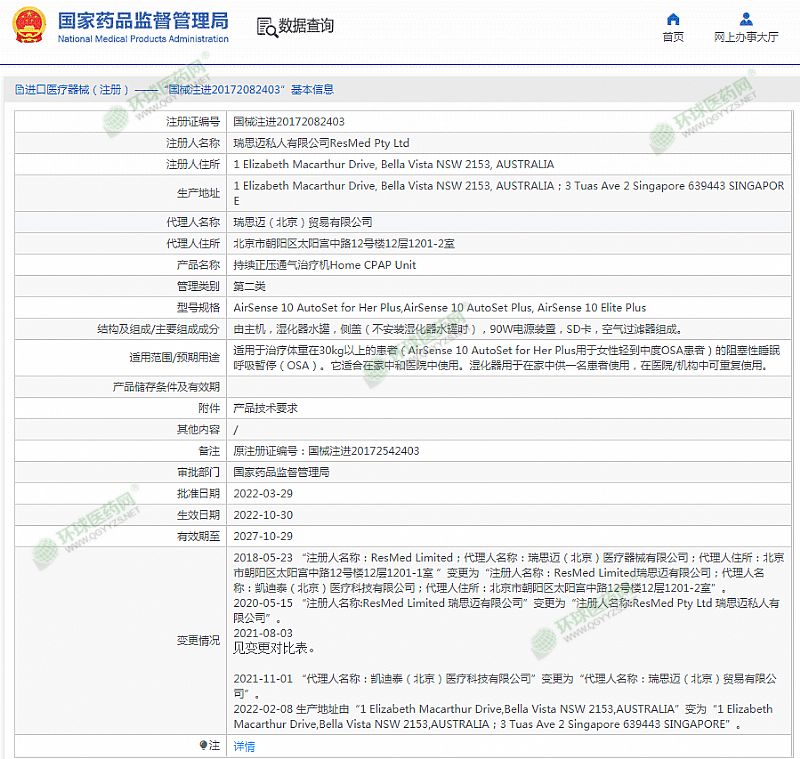 生產(chǎn)企業(yè): 瑞思邁私人有限公司ResMed Pty Ltd