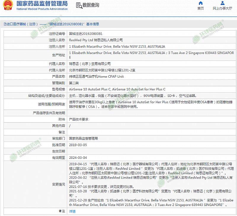 生產(chǎn)企業(yè): ResMed Pty Ltd 瑞思邁私人有限公司