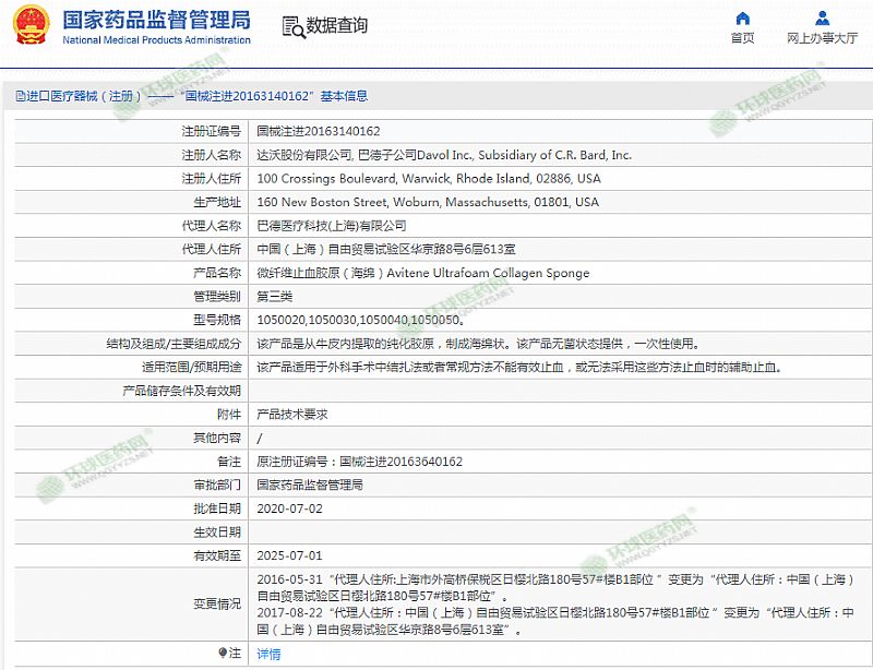 生產(chǎn)企業(yè): 達(dá)沃股份有限公司, 巴德子公司Davol Inc., Subsidiary of C.R. Bard