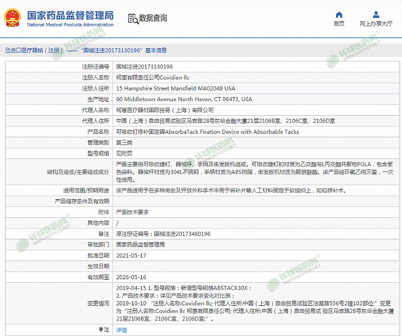| 產(chǎn)品用途 | 該產(chǎn)品適用于在多種微創(chuàng)及開放外科手術中用于將補片等人工材料固定于軟組織上,如疝修補術。 有效期至 2026-05-16 |