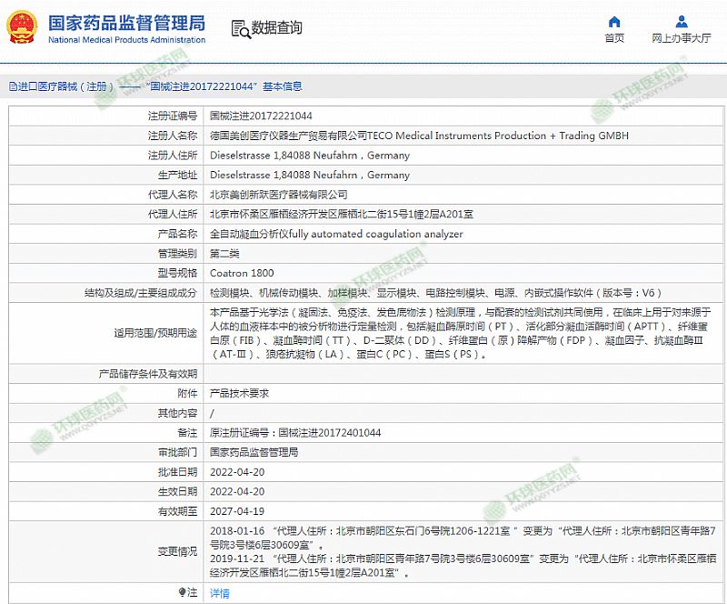 | 產(chǎn)品用途 | 本產(chǎn)品基于光學(xué)法原理,與配套試劑共同使用,在臨床上對來源于人體的血液樣本中的被分析物進行定量檢測,包括凝血酶原時間(PT)、凝血酶時間(TT)、活化部分凝血活酶時間(APTT)、纖維蛋白原(FIB)、D-二聚體(DD)、凝血因子Ⅶ(FⅦ)。 有效期至 2027-04-19 |