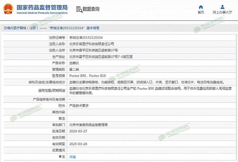 | 產(chǎn)品用途 | 血糖儀與北京樂普醫(yī)療科技有限責任公司生產(chǎn)的Poctor800血糖試紙配合使用。用于體外定量檢測新鮮人毛細血管中的葡萄糖濃度。 有效期至 2025-03-26 |