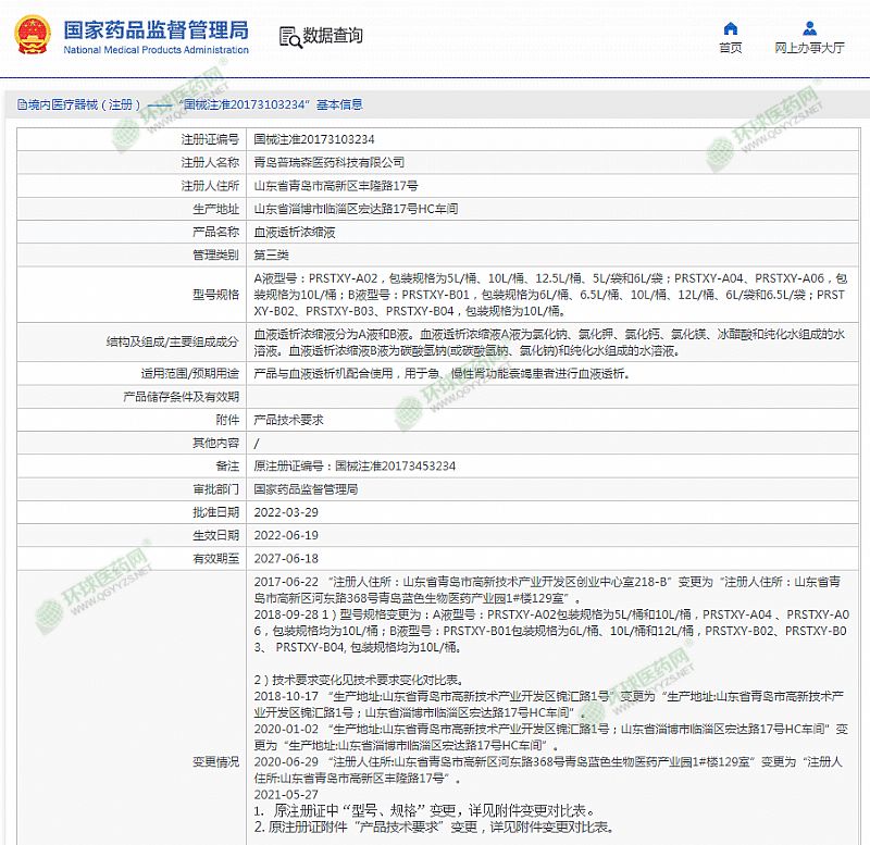 | 產(chǎn)品用途 | 產(chǎn)品與血液透析機(jī)配合使用,用于急、慢性腎功能衰竭患者進(jìn)行血液透析。 有效期至 2027-06-18 |
