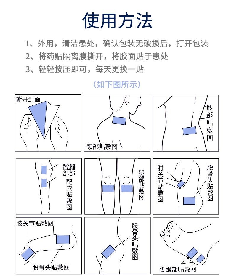 | 使用方法 | 使用說明:1、撕開包裝袋,取出貼片,剝?nèi)シ勒衬,將貼片對準使用部位,輕按整個貼片使之貼敷于皮膚上。2、用于頸、肩、腰、腿、關(guān)節(jié)、急性扭挫傷、骨折等引起的閉合性軟組織疼痛時,可根據(jù)不同的癥狀和疼痛部位,依據(jù)貼敷療法進行貼敷,或根據(jù)不同的穴位進行穴位貼敷。3、本品為外用一次性貼膏,請勿重復(fù)使用。4、特殊部位如不易貼敷可使用膠帶固定。(拉薩瀧沐藥珍堂健康產(chǎn)業(yè)發(fā)展有限公司) |
