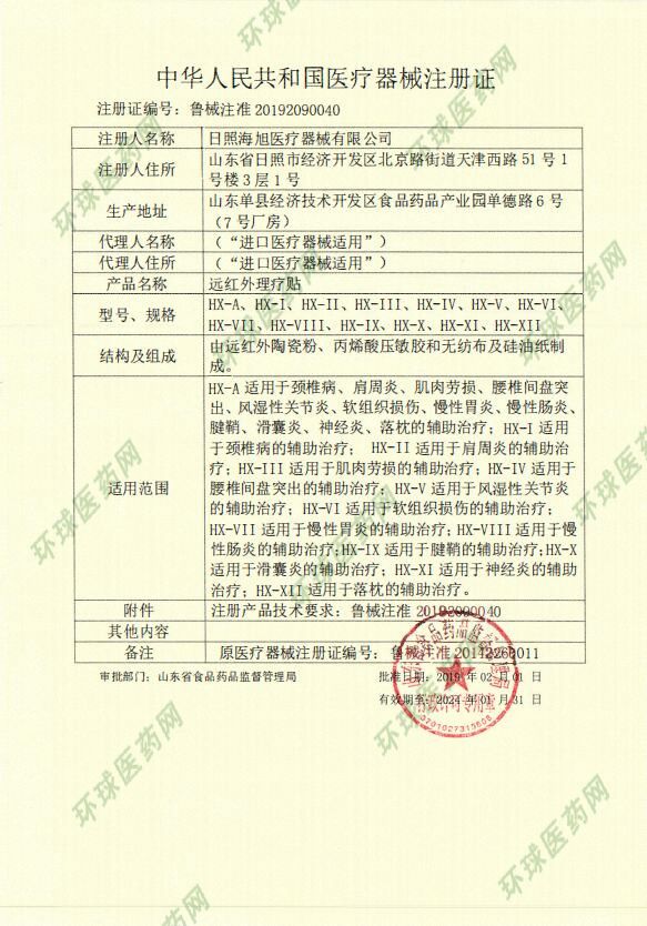 | 補(bǔ)充說明 | 【產(chǎn)品名稱】遠(yuǎn)紅外理療貼 【產(chǎn)品結(jié)構(gòu)】遠(yuǎn)紅外理療貼由遠(yuǎn)紅外陶瓷粉.丙烯酸壓敏膠和無紡布及硅油紙組成。 【適用范圍】適用于頸椎病、肩周炎、肌肉勞損、腰椎間盤突出、風(fēng)濕性關(guān)節(jié)炎、軟組織損傷、慢性胃炎、慢性腸炎、腱鞘炎、滑囊炎、神經(jīng)炎、落枕的輔助治療。 【使用方法】清潔患處,取出貼劑揭開防粘層,將膠面貼于患處,輕輕按壓即可,每24小時(shí)更換一次。 【禁 忌 癥】皮膚病、急性期炎癥患者、皮膚潰爛處、孕婦下腹部禁用。 【貯 存】密封,置陰涼干燥處保存 【執(zhí)行標(biāo)準(zhǔn)】YZB/魯0192-2011 【生產(chǎn)許可】魯食藥監(jiān)械生產(chǎn)許20110057號 【注冊證號】魯食藥監(jiān)械(準(zhǔn))字2014第2260011號 【規(guī) 格】7cm×10cm×3貼×2袋 【生 產(chǎn)】日照海旭醫(yī)療器械有限公司 【地 址】莒縣城陽東工業(yè)園 |