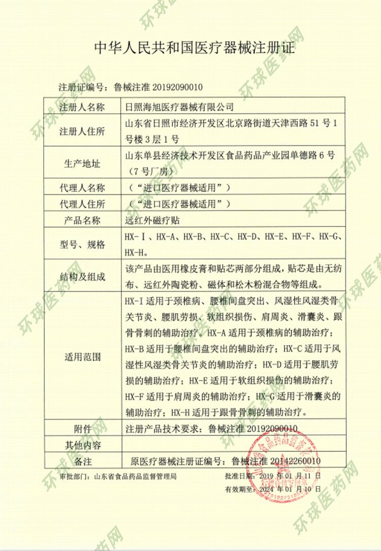 | 補充說明 | 【產(chǎn)品名稱】遠紅外磁療貼 【產(chǎn)品型號】HX-D 【產(chǎn)品結構】該產(chǎn)品由醫(yī)用壓敏膠和貼芯、遠紅外陶瓷粉、磁體等組成。 【適用范圍】適用于腰肌勞損的輔助治療。 【使用方法】使用本品時,先清潔患部皮膚,揭去防粘膜將本品直接貼于患處,將膠膜緊貼皮膚并壓緊周邊,使粘貼材料貼實。2-3日更換一次。 【禁 忌 癥】局部皮膚破損、感染者、孕婦禁用;佩帶心臟起搏器者禁用皮膚過敏者慎用。 【貯 存】密封、置陰涼干燥處保存。 【執(zhí)行標準】YZB/魯0098-2008 【生產(chǎn)許可】魯食藥監(jiān)械生產(chǎn)許20110057號 【注冊證號】魯食藥監(jiān)械(準)字2014第2260010號 【規(guī) 格】9.5cm×13cm×1貼×3袋x300盒/件 【生 產(chǎn)】日照海旭醫(yī)療器械有限公司 【地 址】莒縣城陽東工業(yè)園 【生產(chǎn)日期】見封口 【有效日期】二年 |