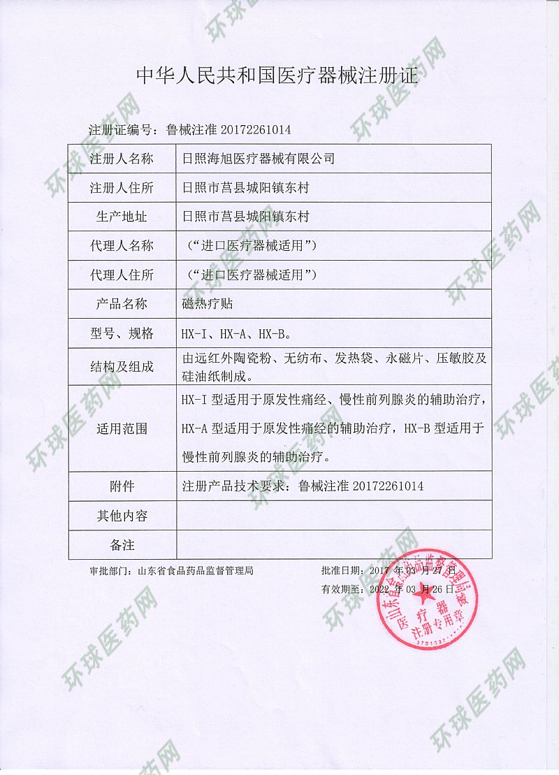 | 補充說明 | 【產(chǎn)品名稱】磁熱療貼 【型號】HX-B 【結(jié)構(gòu)及組成】由遠紅外陶瓷粉、無紡布、發(fā)熱袋、永磁片、壓敏膠及硅油紙制成。 【適用范圍】HX-B型適用于慢性前列腺炎的輔助治療。 【注意事項】1、僅限一次性使用,用后銷毀; 2、包裝如有破損,嚴禁使用; 3、使用時嚴格按照使用說明進行; 4、服帖后無熱感,如有過敏等不適,應(yīng)停止敷貼。 【慎用】皮膚感覺障礙、過敏體質(zhì)、糖尿病、小兒患者。 【禁忌癥】24小時急性創(chuàng)傷的局部、皮膚破損、高熱患者、急性期炎癥患者、孕婦下腹部、血友病患者、活動性結(jié)核患者、惡性腫瘤患者。 【警示】防止?fàn)C傷,當(dāng)熱源使用有不適或癥狀加重時,及時就醫(yī)。 【使用說明】清潔患處,確認包裝無破損后,打開包裝,取出磁熱療貼,將貼劑的隔離膜撕去,貼于患處,每24小時更換一次。 【規(guī)格】90mmX110mmX1貼X3袋 【注冊證編號】魯械注準201722611014 【產(chǎn)品技術(shù)要求編號】魯械注準20172261014 【生產(chǎn)許可證號】魯食藥監(jiān)械生產(chǎn)許20110057號 【生產(chǎn)單位】日照海旭醫(yī)療器械有限公司 【生產(chǎn)地址】山東單縣經(jīng)濟技術(shù)開發(fā)區(qū)食品藥品產(chǎn)業(yè)園單德路6號(7號廠房) 【注冊地址】山東省日照市莒縣城陽街道東關(guān)社區(qū)東村(莒州路東側(cè)) 【生產(chǎn)日期】見封口 【有效期】兩年 |