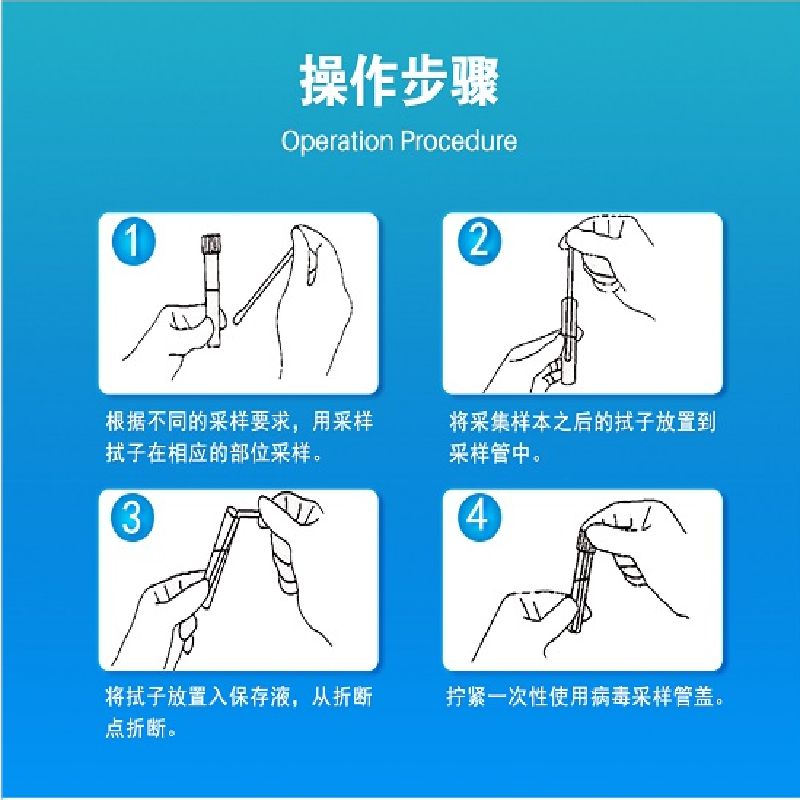 | 使用方法 | 1、根據不同的采樣要求,用采樣拭子在相應的部位采樣。 2、將采集樣本之后的拭子放置到采樣管中。 3、將拭子放置入保存液從折斷點折斷。 4、擰緊一次性使用病毒采樣管蓋。 |