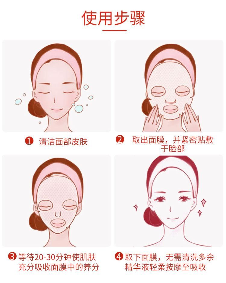 | 使用方法 | 1、面部清潔后,取出面膜。 2將面膜輕敷于全臉,約20-30分鐘后取下。 3、將剩余面膜液輕輕按摩至皮膚吸收。 4、使用后請拋棄,每天使用效果最佳。 |
