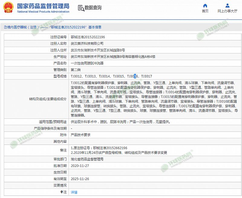 | 產(chǎn)品用途 | 一次性使用膀胱沖洗器 有效期至 2025-11-26 |