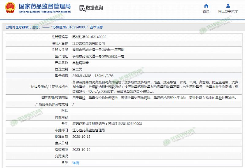 | 產(chǎn)品用途 | 用于鼻腔、鼻竇分泌物結(jié)痂清洗、萎縮性鼻炎藥物清洗、鼻咽癌術后和化療沖洗、職業(yè)性吸入粉塵的鼻腔護理沖洗。 有效期至 2025-10-12 |