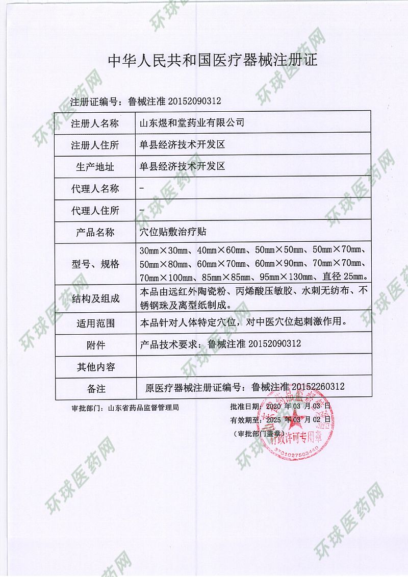 | 補(bǔ)充說(shuō)明 | 使用說(shuō)明 1、清潔相應(yīng)穴位,先以拇指依次揉按相應(yīng)穴位,每穴1~2分鐘,范圍由小到大,力量由輕到重,探尋敏感點(diǎn)。2、確認(rèn)包裝無(wú)破損后,打開(kāi)包裝,取出穴位貼敷治療貼,將貼劑的隔離膜撕去,以鋼珠對(duì)準(zhǔn)相應(yīng)穴位敏感點(diǎn)貼壓,1片/穴、 天,每日適度按壓3~5次,每次3~5分鐘,1個(gè)療程為10天,療程間隔2~3天。 禁忌癥 孕婦、皮膚潰爛處禁用。 慎 用 糖尿病、高熱患者。. 注意事項(xiàng) 1、僅限一次性使用,用后銷(xiāo)毀; 2、叮囑患者定時(shí)按壓,按壓不能過(guò)度用力,以不損傷皮膚為宜; 3、無(wú)粘性、包裝破損或過(guò)有效期禁止使用; 4、夏季多汗,宜勤換; 5、敷貼后如有過(guò)敏等不適,應(yīng)停止敷貼。 儲(chǔ)存條件 本產(chǎn)品應(yīng)貯存在相對(duì)濕度不超過(guò)80%,無(wú)腐蝕性氣體、陰涼、干燥、通風(fēng)良好、清潔的環(huán)境內(nèi)。 [產(chǎn)品技術(shù)要求編號(hào)]魯械注準(zhǔn)20152260316 [注冊(cè)證編號(hào)]魯械注準(zhǔn)20152260316 [生產(chǎn)許可證號(hào)]魯食藥監(jiān)械生產(chǎn)許20130128號(hào) [規(guī) 格] 70mmX 70mm [注冊(cè)人名稱(chēng)/生產(chǎn)企業(yè)/售后服務(wù)機(jī)構(gòu)]濟(jì)南康民藥業(yè)科技有限公司. [生產(chǎn)地址]山東單縣經(jīng)濟(jì)技術(shù)開(kāi)發(fā)區(qū)食品藥品產(chǎn)業(yè)園單德路6號(hào)(3號(hào)廠房) [注冊(cè)人住所/注冊(cè)地址]濟(jì)南市市中區(qū)濟(jì)南萬(wàn)達(dá)商業(yè)廣場(chǎng)4號(hào)商業(yè)辦公樓502室 廠子直銷(xiāo)低價(jià)批發(fā)、代理,可OEM/貼牌代加工 |