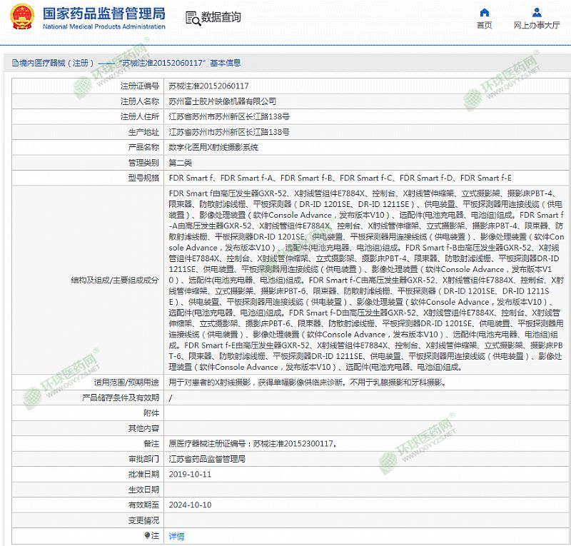 | 補充說明 | FDRSmartf由高壓發(fā)生器GXR-52、X射線管組件E7884X、控制臺、X射線管伸縮架、立式攝影架、攝影床PBT-4、限束器、防散射濾線柵、平板探測器(DR-ID1201SE、DR-ID1211SE)、供電裝置、平板探測器用連接線纜(供電裝置)、影像處理裝置(軟件C0nsoleAdvance,發(fā)布版本V10)、選配件(電池充電器、電池組)組成。FDRSmartf-A由高壓發(fā)生器GXR-52、X射線管組件E7884X、控制臺、X射線管伸縮架、立式攝影架、攝影床PBT-4、限束器、防散射濾線柵、平板探測器DR-ID1201SE、供電裝置、平板探測器用連接線纜(供電裝置)、影像處理裝置(軟件C0nsoleAdvance,發(fā)布版本V10)、選配件(電池充電器、電池組)組成。 有效期至 2024-10-10 |
