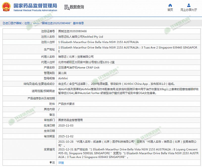生產(chǎn)企業(yè): 瑞思邁私人有限公司ResMed Pty Ltd