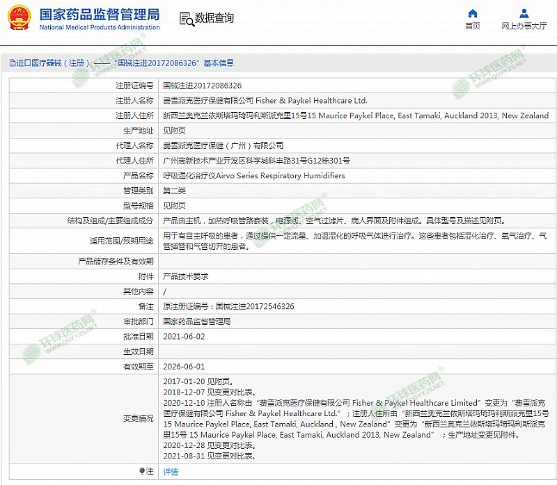 生產(chǎn)企業(yè): 費(fèi)雪派克醫(yī)療保健有限公司 Fisher & Paykel Healthcare Ltd.