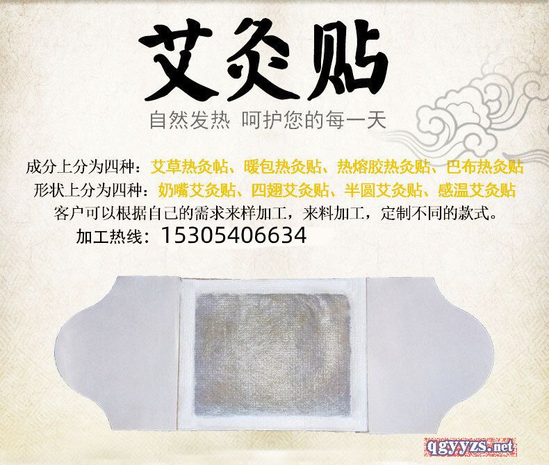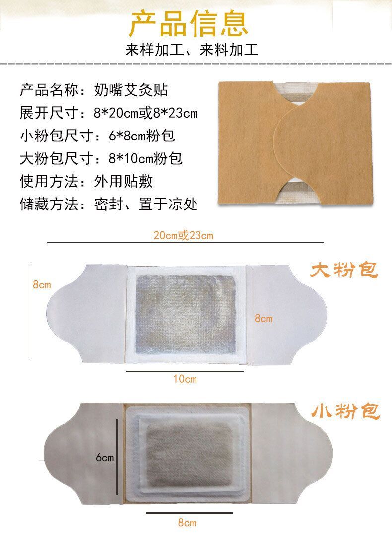 | 產(chǎn)品用途 | 產(chǎn)品名稱:奶嘴艾灸貼 展開尺寸:8*20cm或8*23cm 小粉包尺寸:6*8cm粉包 大粉包尺寸:8*10cm粉包 使用方法:外用貼敷 儲藏方法:密封、置于涼處 您還在用幾千年前的艾灸方法嗎? 新款艾灸貼,告別煙熏火燎的傳統(tǒng)艾灸 |