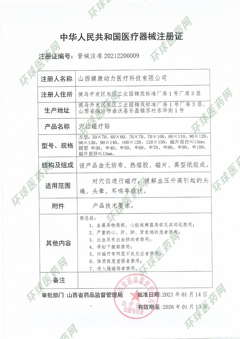 | 補(bǔ)充說明 | 【產(chǎn)品名稱】穴位磁療貼【高血壓貼】 【型 號(hào)】方型、圓形 【規(guī) 格】50mm×70mm、60mm×60mm、70mm×70mm、70mm×100mm、80mm×110mm、90mm×120mm、90mm×130mm、90mm×140mm、100mm×120mm、120mm×150mm,磁片偏直徑≤13mm;φ30mm、φ40mm、φ50mm、φ60mm、φ70mm、φ80mm、φ90mm、φ100mm,磁片偏直徑≤13mm。 【結(jié)構(gòu)組成】該產(chǎn)品由無紡布、熱熔膠、磁片、離型紙組成。 【適用范圍】對(duì)穴位進(jìn)行磁療,緩解血壓升高引起的頭痛、頭暈、耳鳴等癥狀。 【產(chǎn)品性能】穴位磁療貼平肝潛陽、調(diào)和氣血。貼敷于曲池、合谷、太沖、三陰交、涌泉等穴位,利用磁場(chǎng)強(qiáng)度20mT-200mT的磁體作用,使磁場(chǎng)透過皮毛腠理由表入內(nèi),通經(jīng)絡(luò),聯(lián)絡(luò)臟腑,溝通表里。通過刺激穴位對(duì)局部氣血進(jìn)行調(diào)整,行氣血、調(diào)陰陽,恢復(fù)機(jī)體陰陽平衡狀態(tài)。持粘性不超過2.5mm,剝離強(qiáng)度應(yīng)不低于1.0N/cm。 【使用方法】使用前請(qǐng)清潔貼敷部位皮膚,沿缺口處撕開密封包裝袋,取出產(chǎn)品,揭去離型紙,將貼片對(duì)準(zhǔn)穴位(穴位請(qǐng)參照穴位圖,如不能精準(zhǔn)取穴,請(qǐng)?jiān)卺t(yī)護(hù)人員指導(dǎo)下使用),每貼使用6-12小時(shí)。建議貼敷部位為曲池、合谷、太沖、三陰交、涌泉。 【禁忌癥】 1.金屬異物局部、心臟起搏器局部及其鄰近禁用; 2.嚴(yán)重的心、肝、肺、腎衰竭的患者禁用; 3.出血及有出血傾向者禁用; 4.孕婦下腹部禁用; 5.對(duì)磁療有明顯不良反應(yīng)者禁用; 6.體質(zhì)極度虛弱者禁用; 7.進(jìn)入強(qiáng)磁場(chǎng)者禁用。 【注意事項(xiàng)】 1.使用前清潔貼敷部位。 2.請(qǐng)勿貼敷在皮膚過敏處。 3.若皮膚有不適感,請(qǐng)立即停止使用。 4.本品為外用一次性產(chǎn)品,請(qǐng)勿反復(fù)使用。 5.對(duì)磁場(chǎng)敏感者如產(chǎn)生頭暈、嘔吐等暈磁現(xiàn)象,應(yīng)立即停用。 【儲(chǔ)存方法】應(yīng)貯存在通風(fēng)干燥處,無腐蝕性氣體的室內(nèi)。 【配件清單】穴位磁療貼、說明書、穴位圖。 【有效期】二年 【生產(chǎn)日期】見外盒 【生產(chǎn)許可證號(hào)】晉食藥監(jiān)械生產(chǎn)許20160009號(hào) 【產(chǎn)品注冊(cè)證號(hào)】晉械注準(zhǔn)20212200009 【產(chǎn)品技術(shù)要求】晉械注準(zhǔn)20212200009 【注冊(cè)及生產(chǎn)企業(yè)】山西健康動(dòng)力醫(yī)療科技有限公司 【注冊(cè)地址】侯馬開發(fā)區(qū)東區(qū)工業(yè)園錦茂標(biāo)準(zhǔn)廠房1 號(hào)廠房3層 【生產(chǎn)地址】侯馬開發(fā)區(qū)東區(qū)工業(yè)園錦茂標(biāo)準(zhǔn)廠房1號(hào)廠房3層 山西省臨汾市曲沃縣樂昌鎮(zhèn)蘇村東華街1號(hào) 【編制日期】2019年03月31日 【售后服務(wù)單位】山西健康動(dòng)力醫(yī)療科技有限公司 穴位磁療貼穴位圖 主穴:曲池、合谷、太沖、三陰交、涌泉。配穴:陰虛陽亢配太溪、肝俞;痰濕壅盛配中脘、豐。粴馓撗雠渥闳、膈俞;陰陽兩虛配關(guān)元、腎俞;心悸怔仲配內(nèi)關(guān)、神門。 |